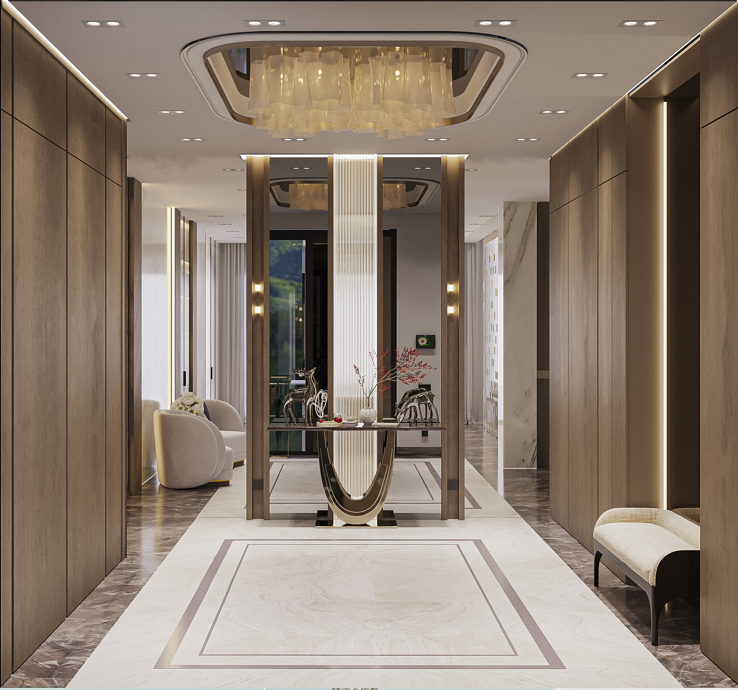 Входная зона встречает гостей высокими деревянными панелями тёплого орехового оттенка и мраморным полом с изысканным и инкрустированным бордюром.