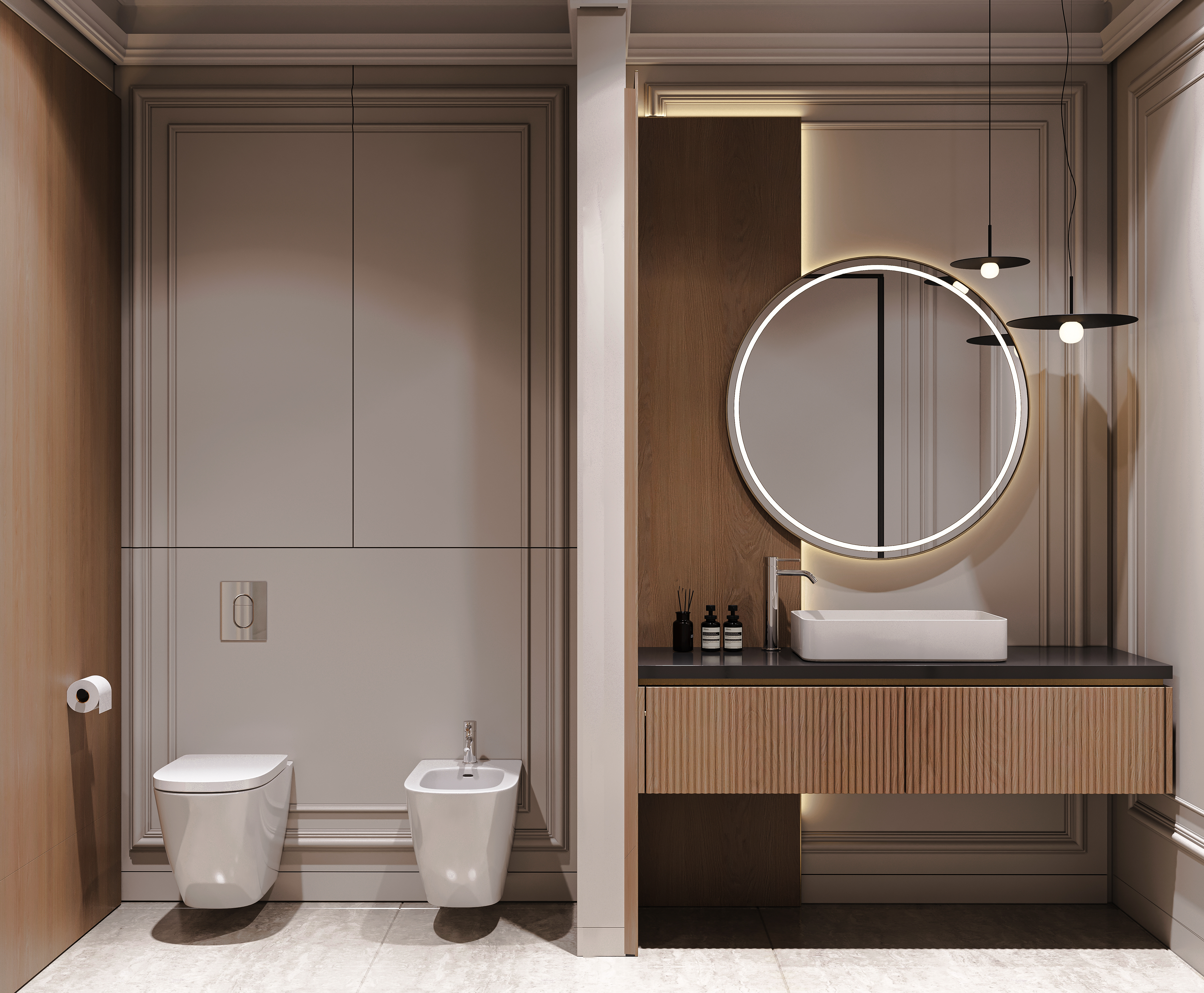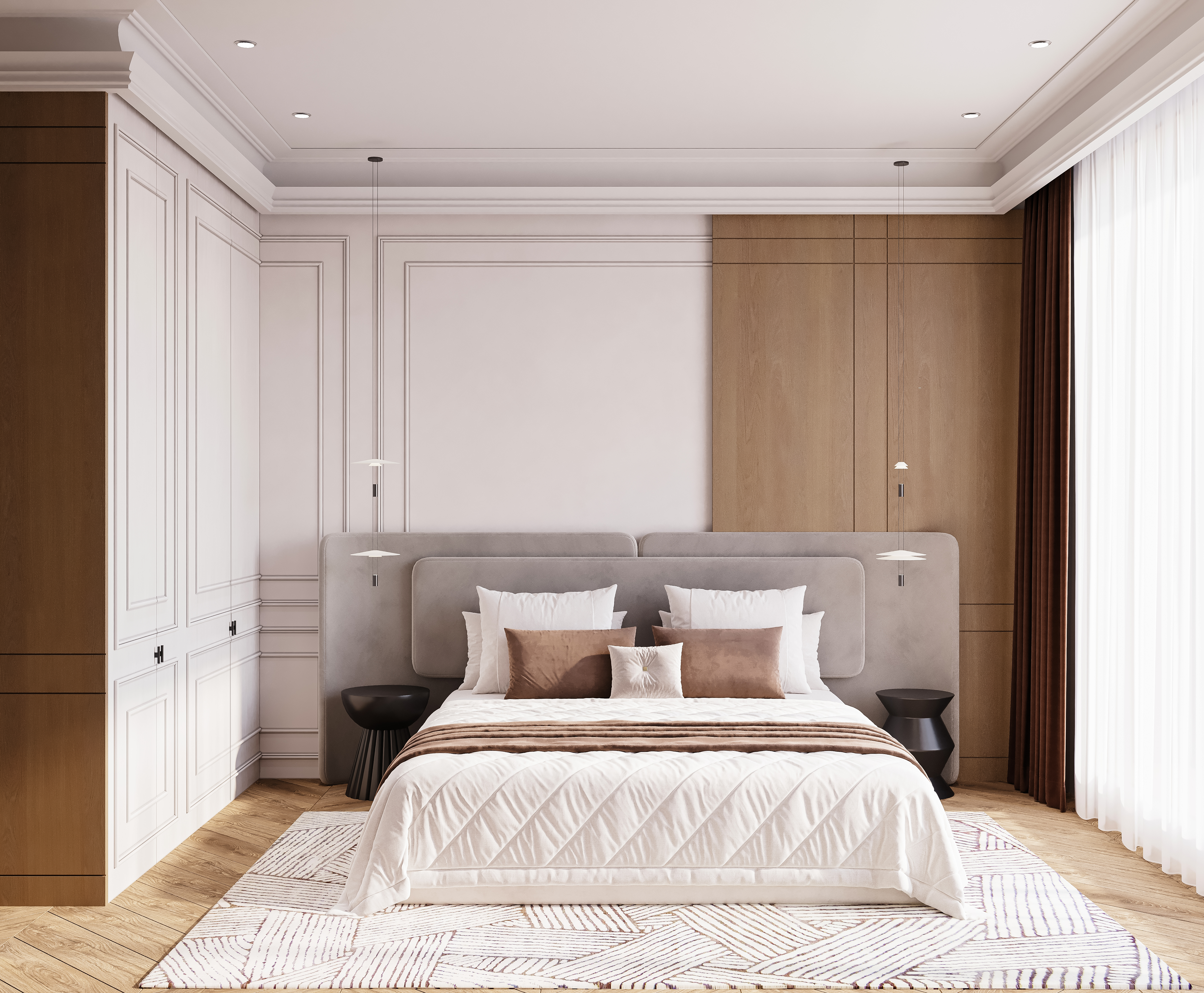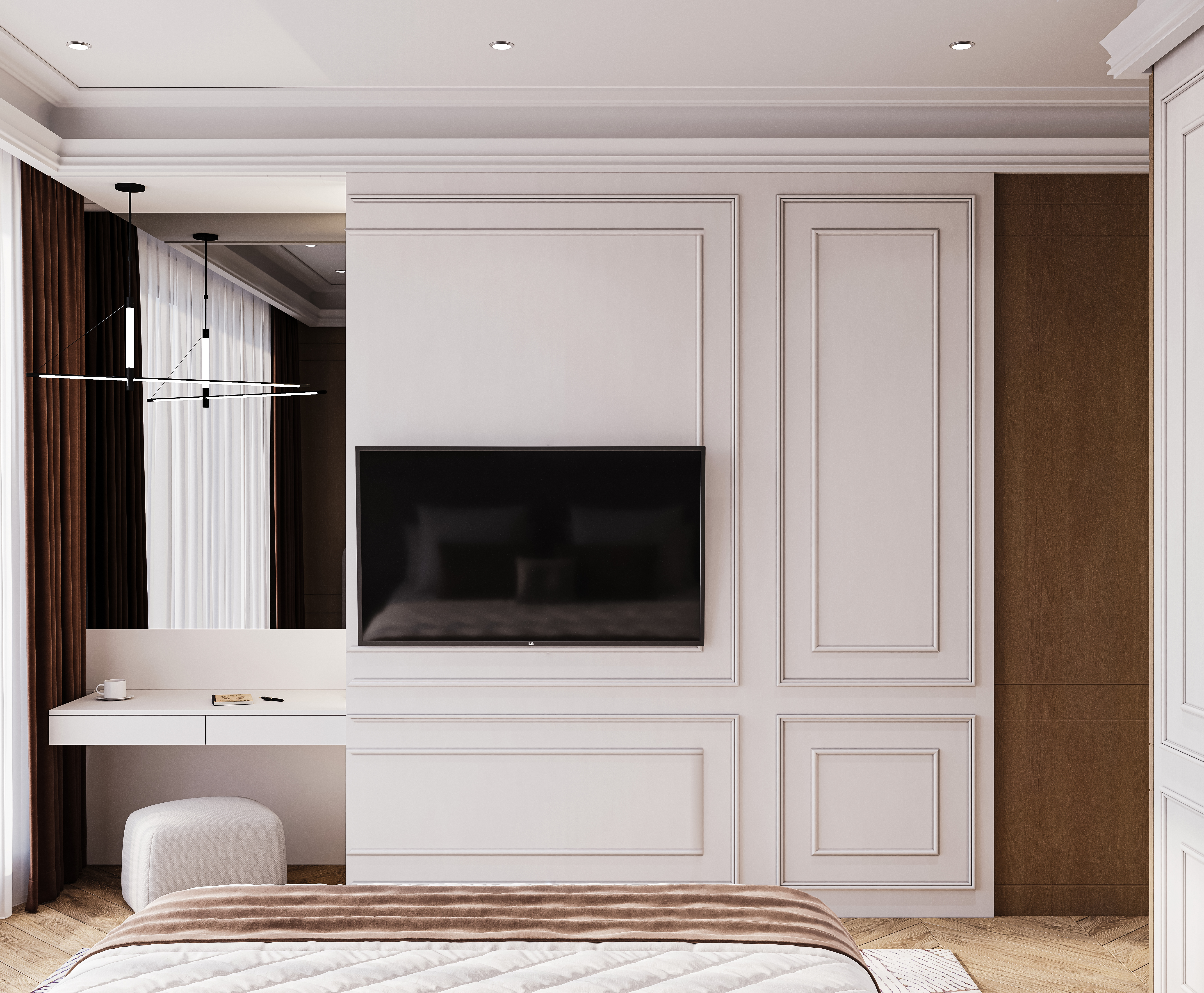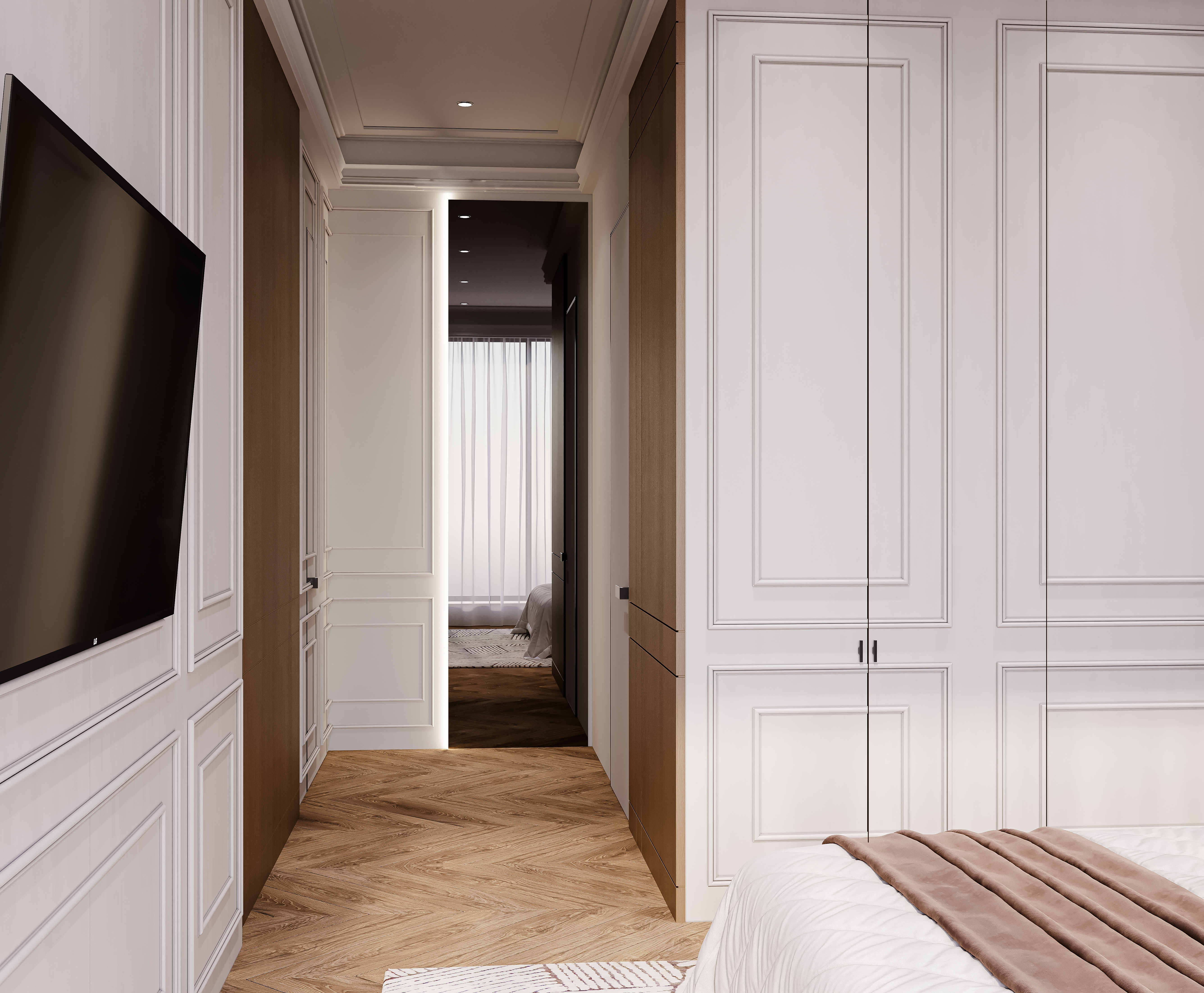 Спальня строится на чувственном контрасте: мягкое изголовье из нежного велюра встречается с кремовой эмалью встроенных шкафов и натуральным деревом панелей. Линейные подвесные светильники встроены в многоуровневую систему, где свет работает одновременно как архитектура и атмосфера.