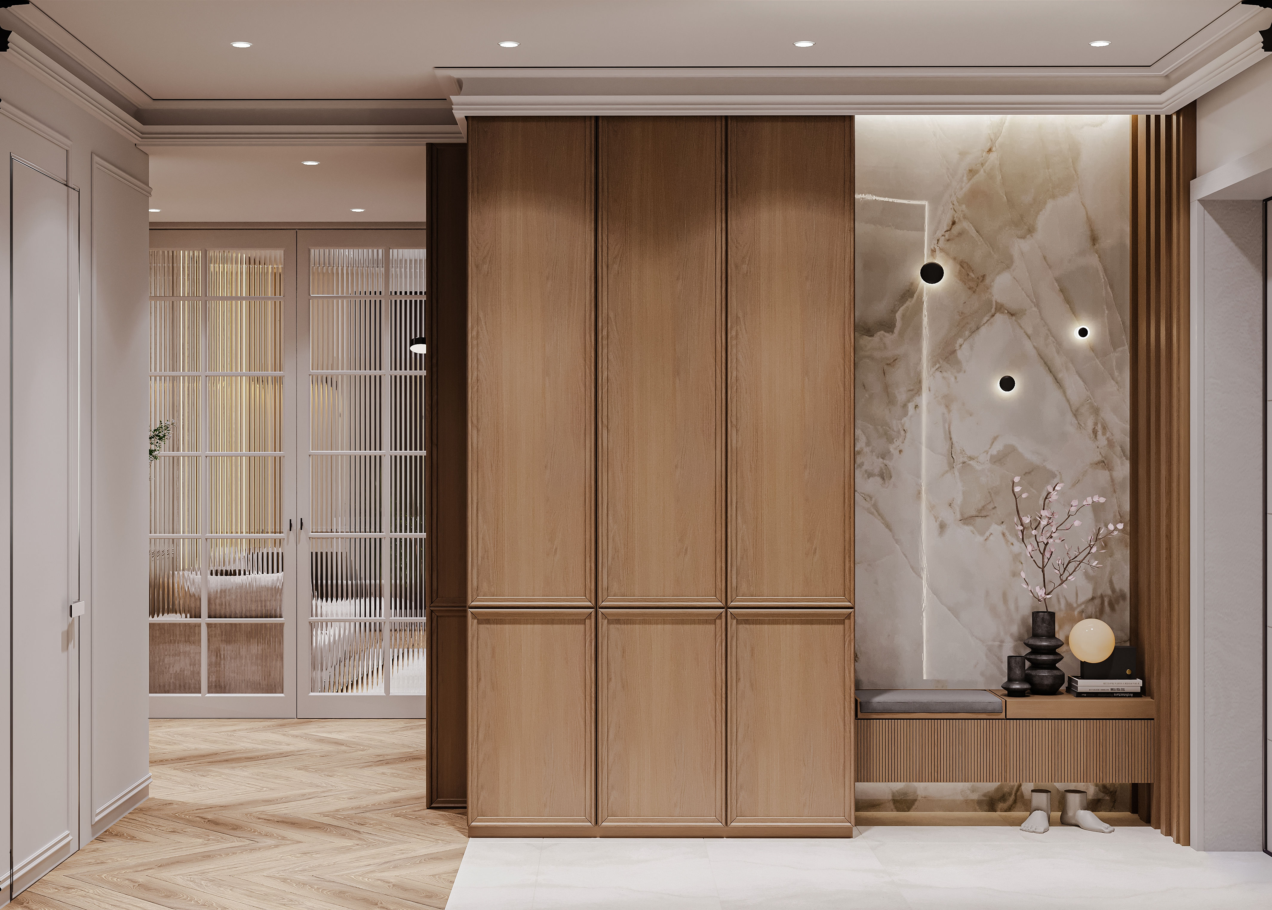 Апартаменты 135 м² построены на балансе неоклассики и минимализма — шевронный паркет из светлого дуба и молдинговая лепнина создают единый язык для всех помещений.