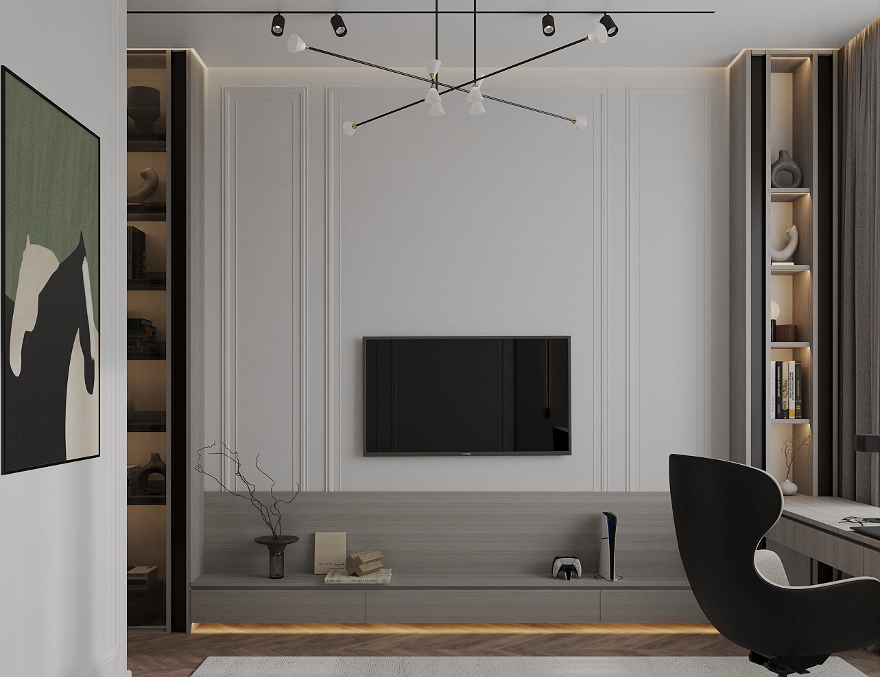 Апартаменты 135 м² построены на балансе неоклассики и минимализма — шевронный паркет из светлого дуба и молдинговая лепнина создают единый язык для всех помещений.